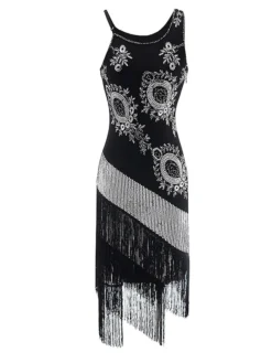 Women’s Retro 1920s Fringe Dress Midi Dress Party Halloween Sequins Tassel Fringe Floral V Neck Sleeveless Regular Fit Spring Fall 2023 Black White S M L XL