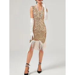 Women's Retro 1920s Fringe Dress Midi Dress Party Halloween Sequins Tassel Fringe Floral V Neck Sleeveless Regular Fit Spring Fall 2023 Black Gold S M L XL