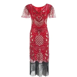 Women’s Retro 1920s Fringe Dress Midi Dress Party Halloween Sequins Tassel Fringe Floral V Neck Short Sleeve Regular Fit Spring Fall 2023 Black Red S M L XL