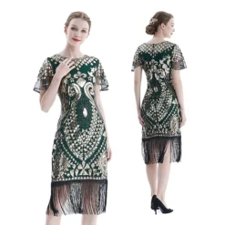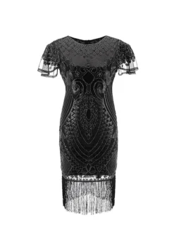 Women’s Retro 1920s Fringe Dress Midi Dress Party Halloween Sequins Tassel Fringe Floral Crewneck Short Sleeve Regular Fit Spring Fall 2023 Black Gold S M L XL