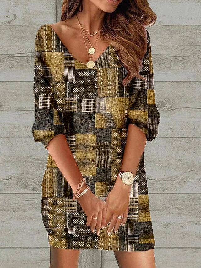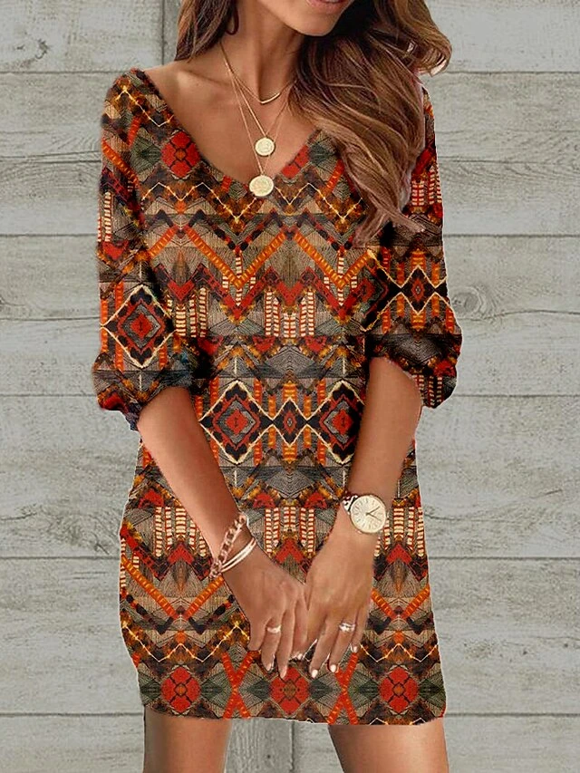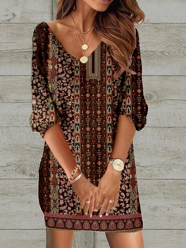 Women’s Casual Dress Ethnic Dress Shift Dress Mini Dress Black Wine Red 3/4 Length Sleeve Floral Print Spring Fall Winter V Neck Fashion Loose Fit 2023 S M L XL XXL 3XL 4XL 5XL
