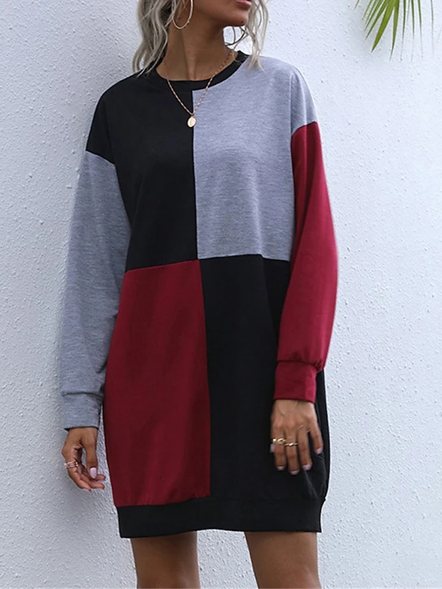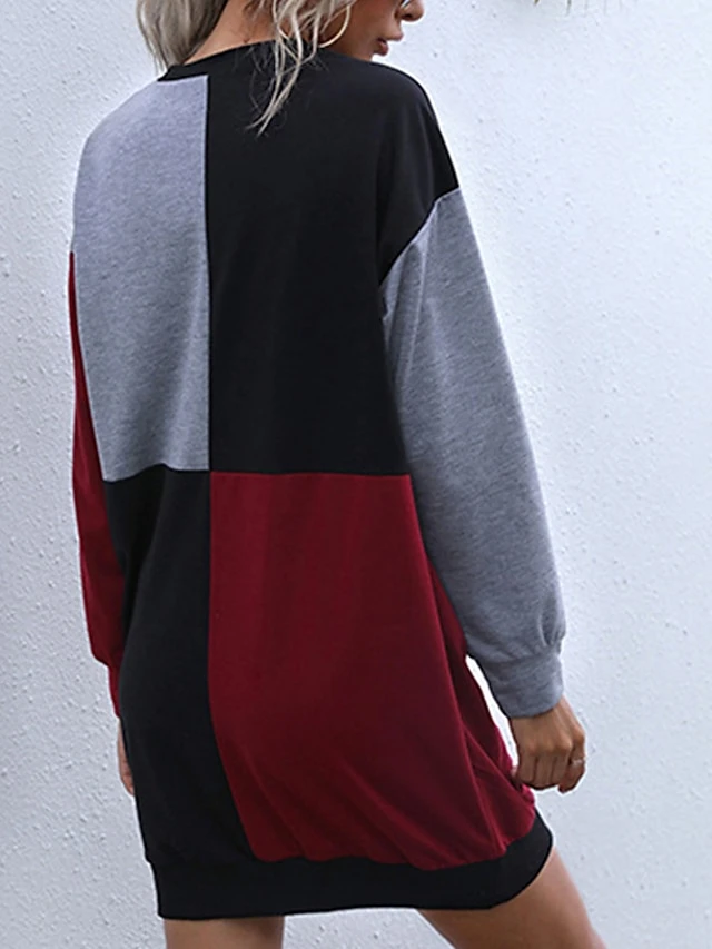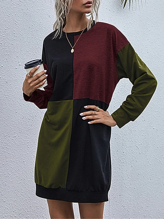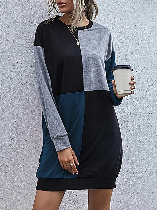 Women’s Casual Dress Hoodie Dress Mini Dress Fashion Daily Outdoor Home Vacation Crew Neck Patchwork Print Loose Fit Blue Army Green Dark Gray S M L XL