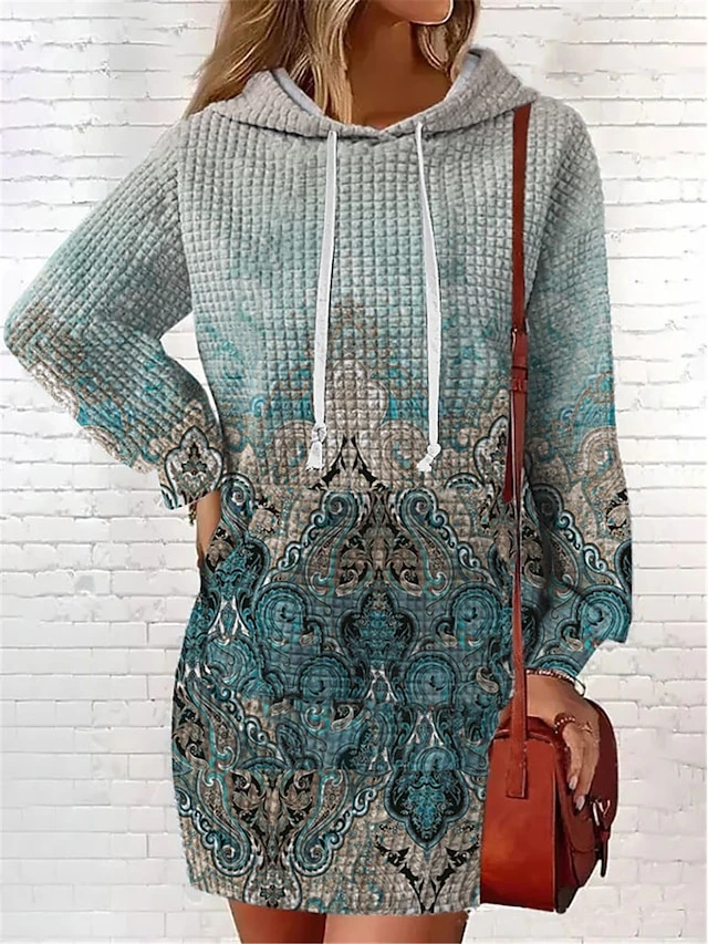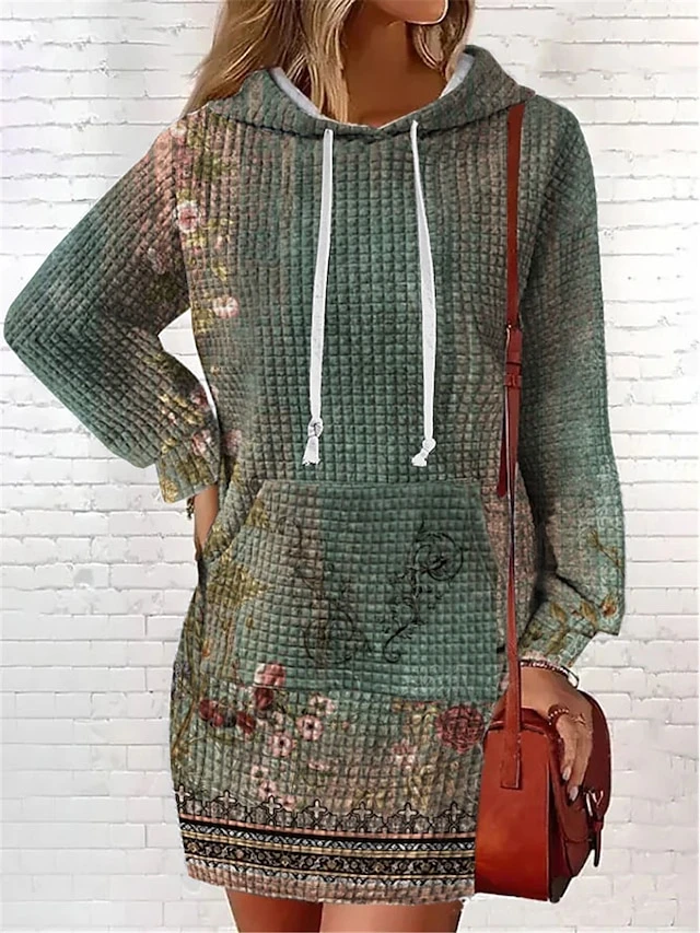 Women’s Casual Dress Hoodie Dress Mini Dress Warm Fashion Outdoor Vacation Going Out V Neck Pocket Print Floral Geometric Loose Fit Pink Burgundy Blue S M L XL XXL