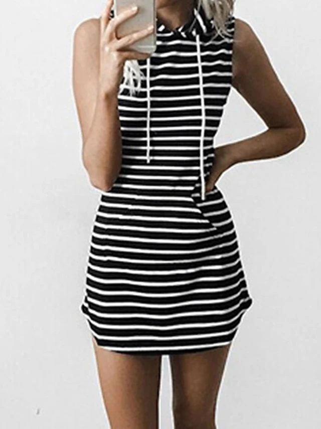 Women’s Casual Dress Hoodie Dress Sheath Dress Mini Dress Black Pink Navy Blue Sleeveless Striped Pocket Spring Fall Winter Hooded Basic 2023 S M L XL XXL