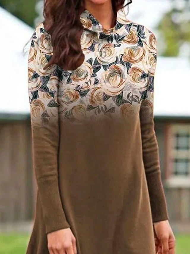 Women’s Casual Dress Hoodie Dress Winter Dress Floral Print Hooded Mini Dress Elegant Ethnic Home Street Long Sleeve Regular Fit Brown Fall Winter S M L XL XXL