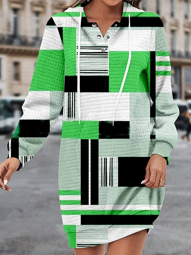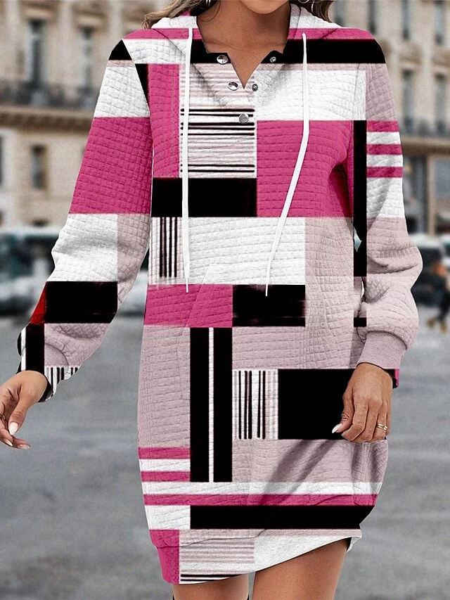 Women’s Casual Dress Hoodie Dress Winter Dress Geometric Plaid Button Print Hooded Mini Dress Fashion Streetwear Outdoor Daily Long Sleeve Regular Fit Pink Blue Green Fall Winter S M L XL XXL