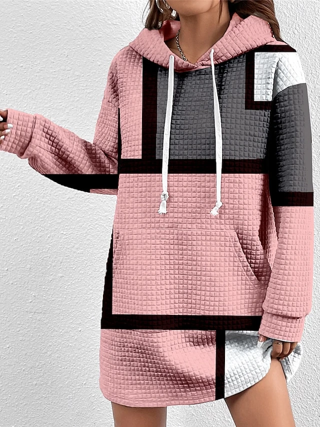 Women’s Casual Dress Hoodie Dress Winter Dress Geometric Plaid Pocket Print Hooded Mini Dress Fashion Streetwear Outdoor Daily Long Sleeve Loose Fit Pink Blue Green Fall Winter S M L XL XXL