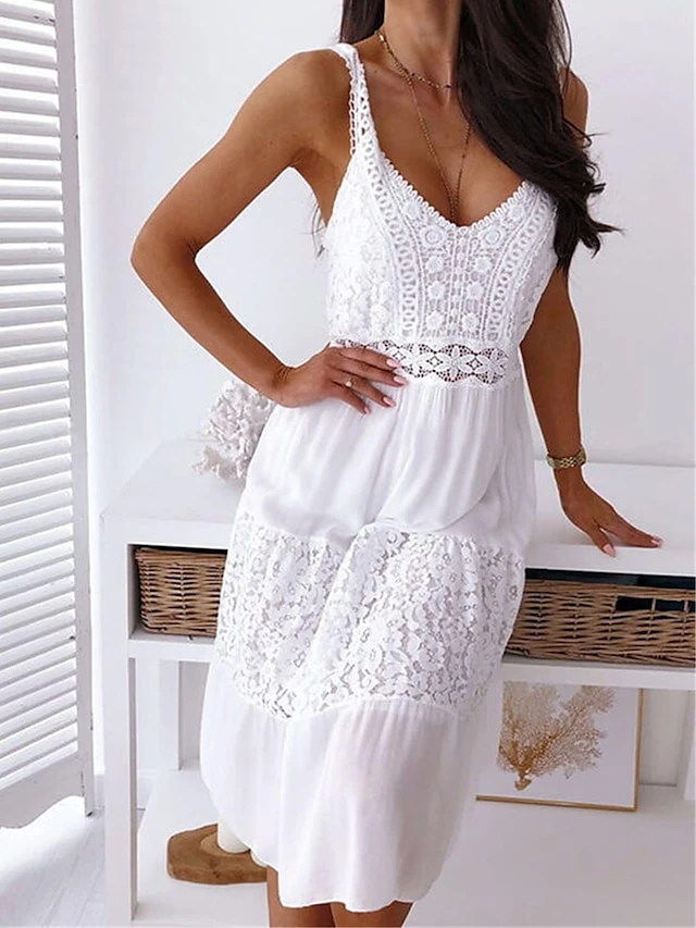 Women’s Casual Dress Lace Dress Shift Dress Plain Lace Backless Strap Midi Dress Basic Fashion Outdoor Daily Sleeveless Regular Fit White Spring Summer S M L XL XXL