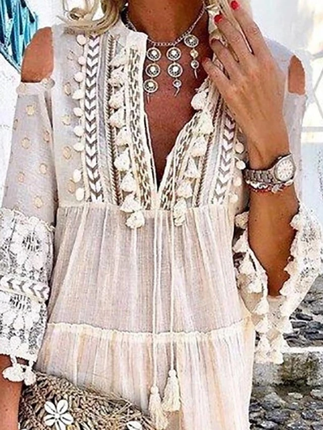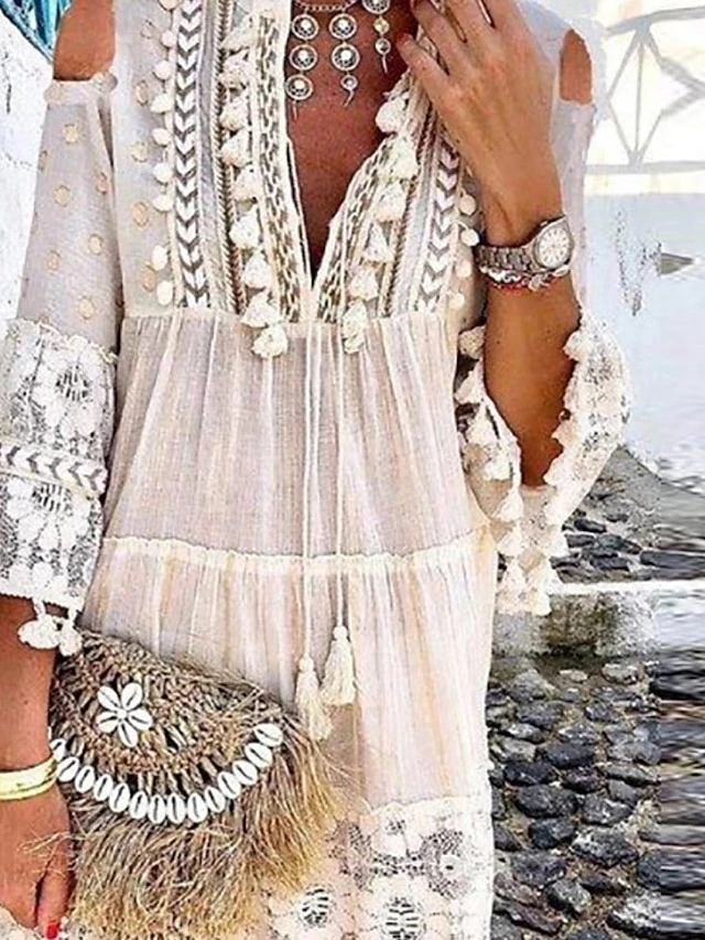Women’s Casual Dress Lace Dress White Dress Midi Dress Lace Patchwork Daily Holiday Vacation Streetwear Basic V Neck Long Sleeve 2023 Loose Fit White Color S M L XL XXL Size