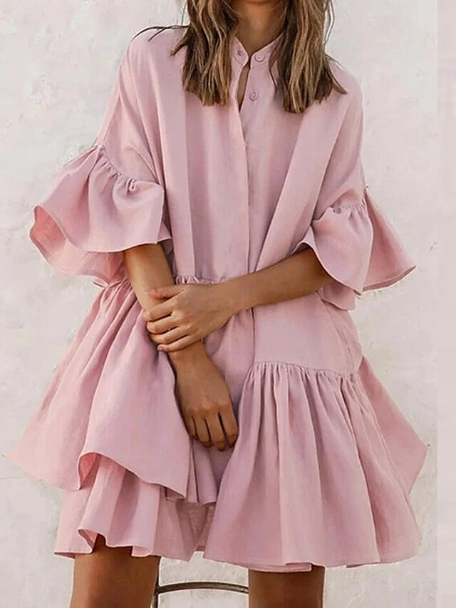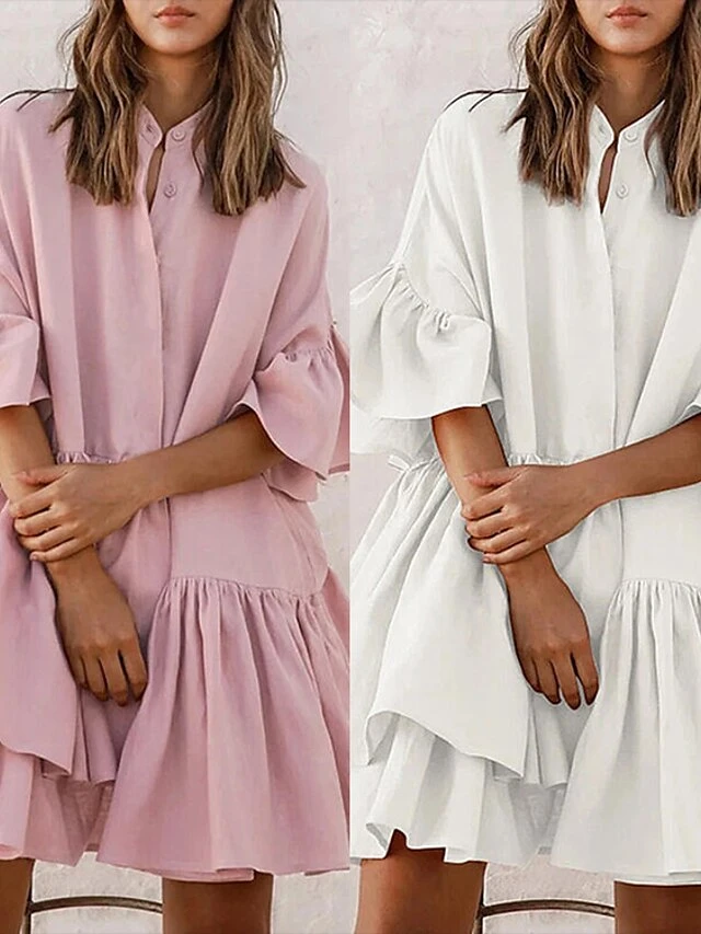 Women’s Casual Dress Mini Dress White Pink Short Sleeve Pure Color Ruffle Summer Spring Shirt Collar Casual Loose Fit 2023 S M L XL 2XL 3XL