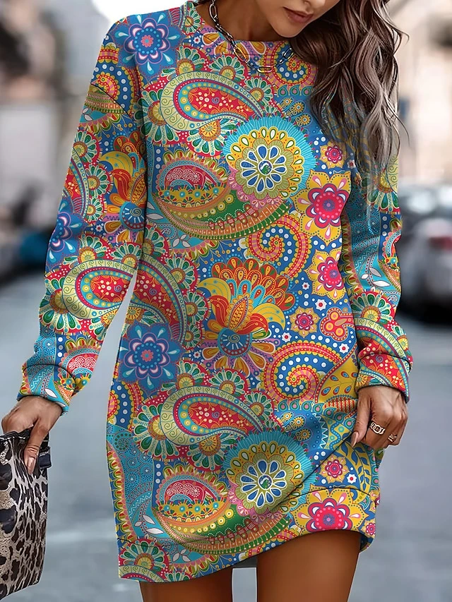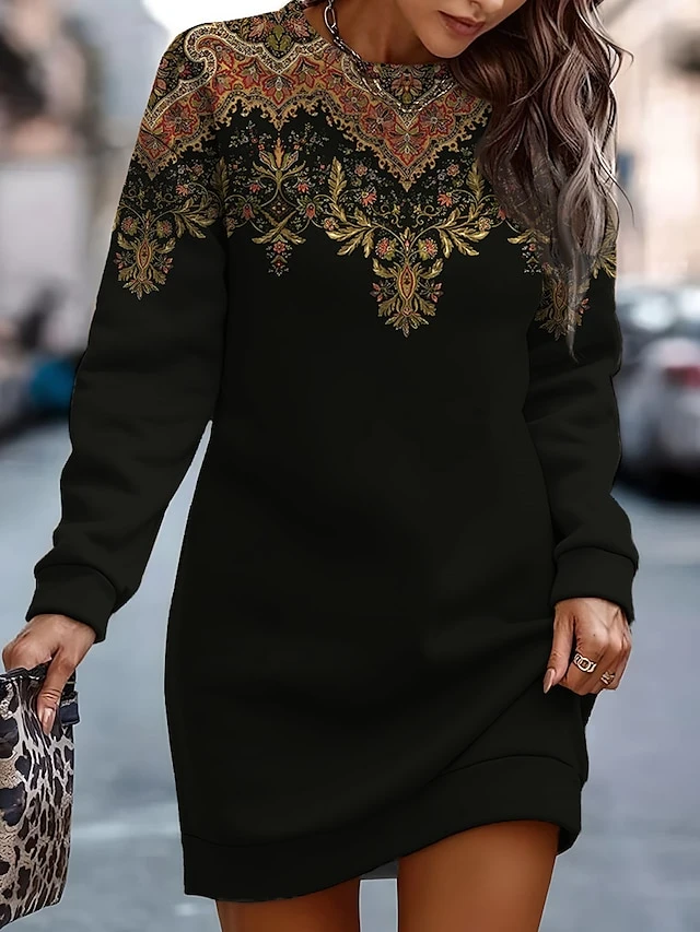 Women’s Casual Dress Sweatshirt Dress Mini Dress Warm Fashion Outdoor Holiday Vacation Crew Neck Print Floral Geometric Print Loose Fit Black Royal Blue Blue S M L XL XXL