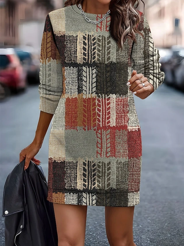 Women’s Casual Dress Sweatshirt Dress Mini Dress Warm Fashion Outdoor Vacation Going Out Crew Neck Print Geometric Loose Fit Red Blue Green S M L XL XXL