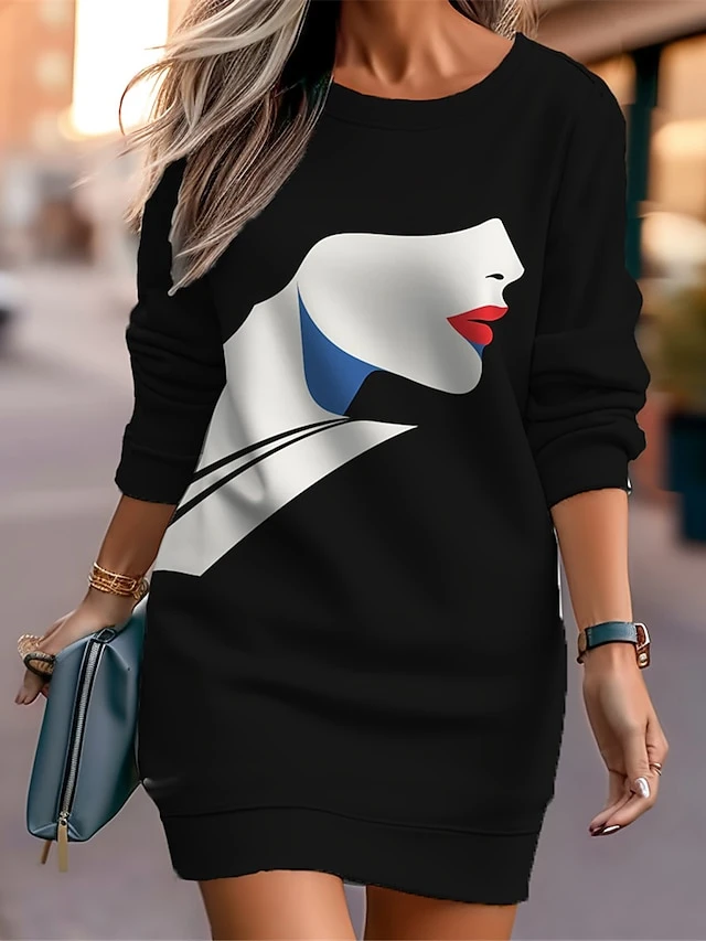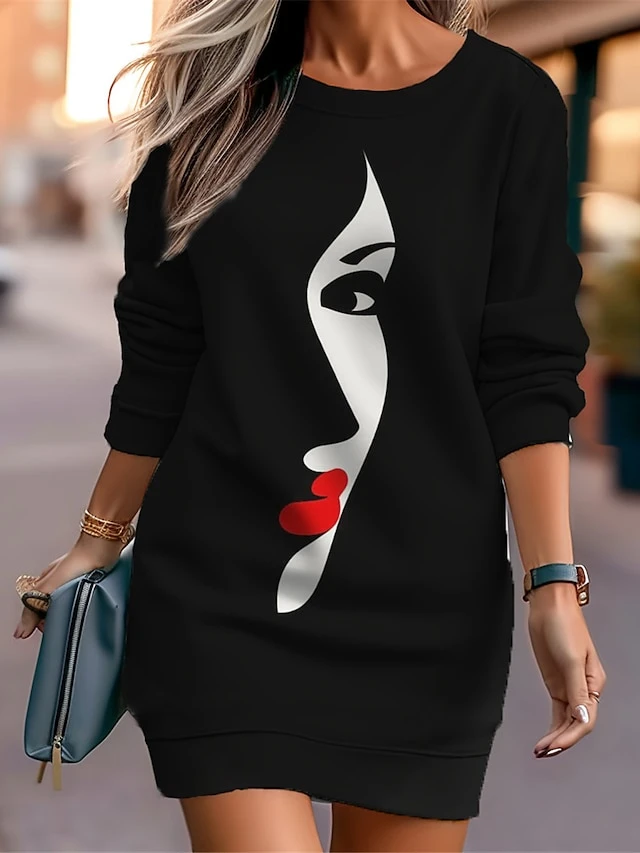 Women’s Casual Dress Sweatshirt Dress Mini Dress Warm Fashion Outdoor Vacation Going Out Crew Neck Print Print Loose Fit Black White Red S M L XL XXL