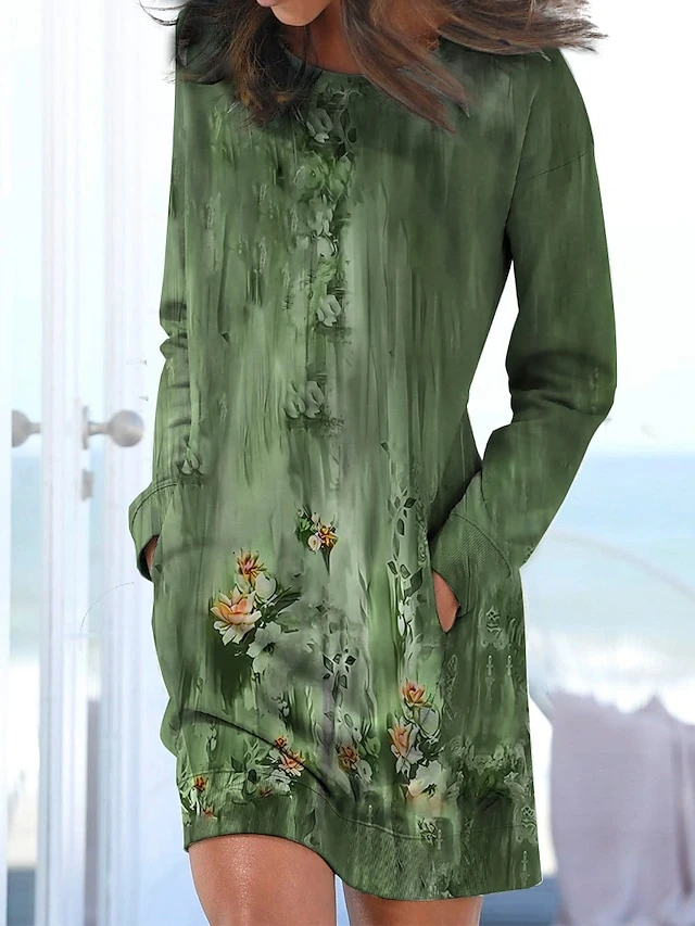 Women’s Casual Dress Sweatshirt Dress Print Dress Floral Pocket Print Crew Neck Mini Dress Fashion Classic Daily Vacation Long Sleeve Loose Fit Green Fall Winter S M L XL XXL