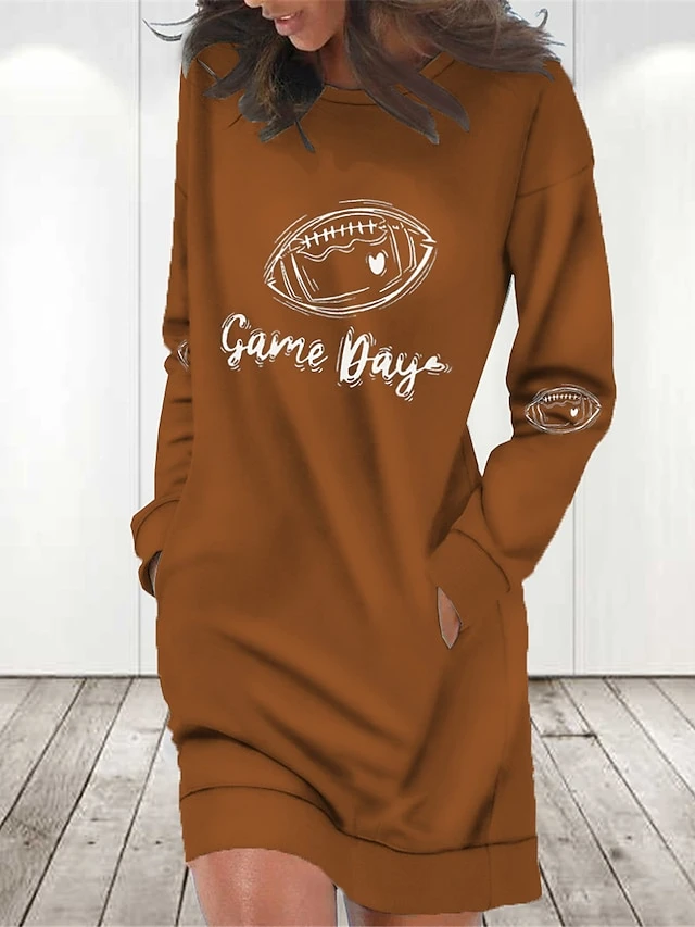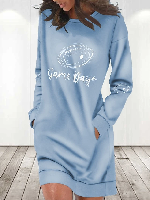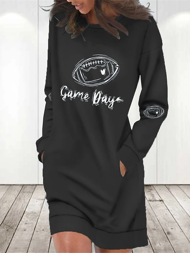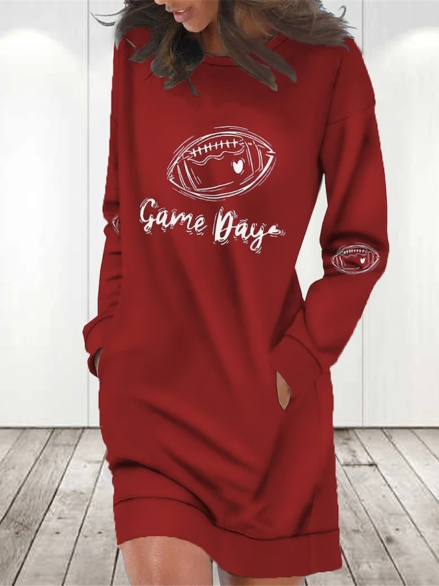 Women’s Casual Dress Sweatshirt Dress Winter Dress Letter Football Pocket Print Crew Neck Mini Dress Fashion Streetwear Outdoor Daily Long Sleeve Loose Fit Black Red Blue Fall Winter S M L XL XXL