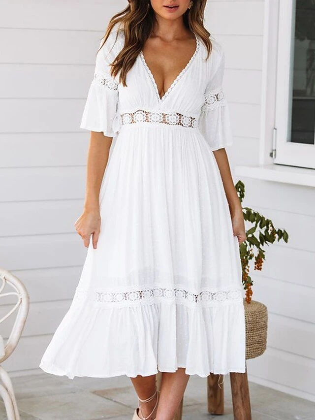 Women’s Casual Dress Swing Dress Summer Dress Plain Ruffle V Neck Midi Dress Basic Fashion Outdoor Daily Half Sleeve Loose Fit White Spring Summer S M L XL