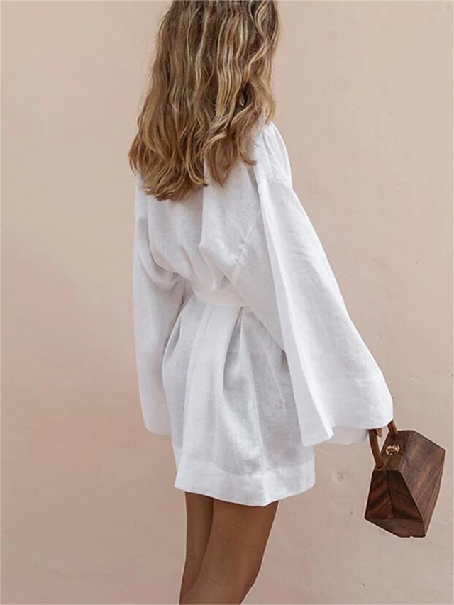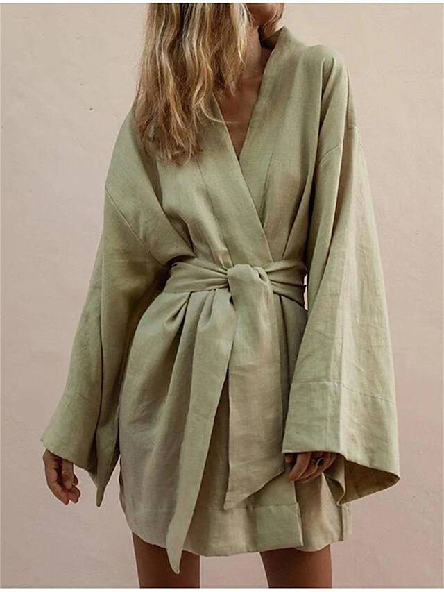 Women’s Casual Dress Winter Dress Linen Dress Mini Dress White Green Long Sleeve Pure Color With Belt Summer Spring V Neck Fashion Vacation Fall Dress Spring Dress Loose Fit 2023 S M L XL 2XL