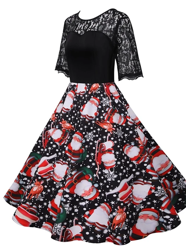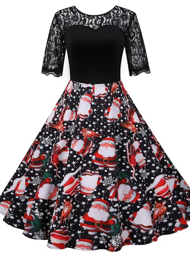 Women’s Christmas Casual Dress Lace Dress Midi Dress Black Short Sleeve Santa Claus Hat Lace Print Winter Fall V Neck Vintage Elegant Casual 2022 S M L XL 2XL 3XL
