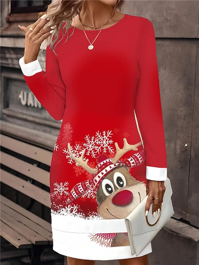 Women‘s Christmas Casual Dress Sweatshirt Dress Mini Dress Active Fashion Outdoor Holiday Crew Neck Print Snowman Tree Loose Fit Black White Wine S M L XL XXL