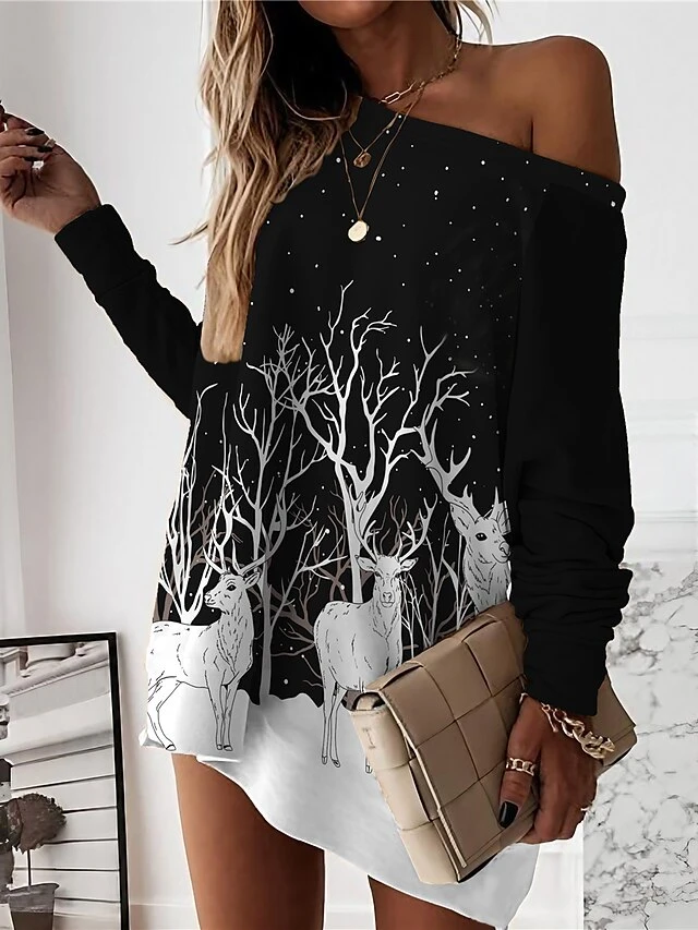 Women‘s Christmas Casual Dress Sweatshirt Dress Mini Dress Warm Fashion Outdoor Holiday Crew Neck Print Animal Tree Loose Fit Black Red Burgundy S M L XL XXL