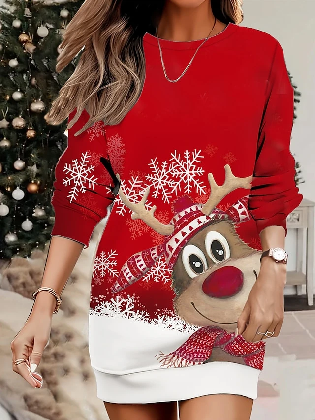 Women’s Christmas Casual Dress Sweatshirt Dress Mini Dress Warm Fashion Outdoor Vacation Crew Neck Print Santa Claus Snowman Loose Fit White Wine Rusty Red S M L XL XXL