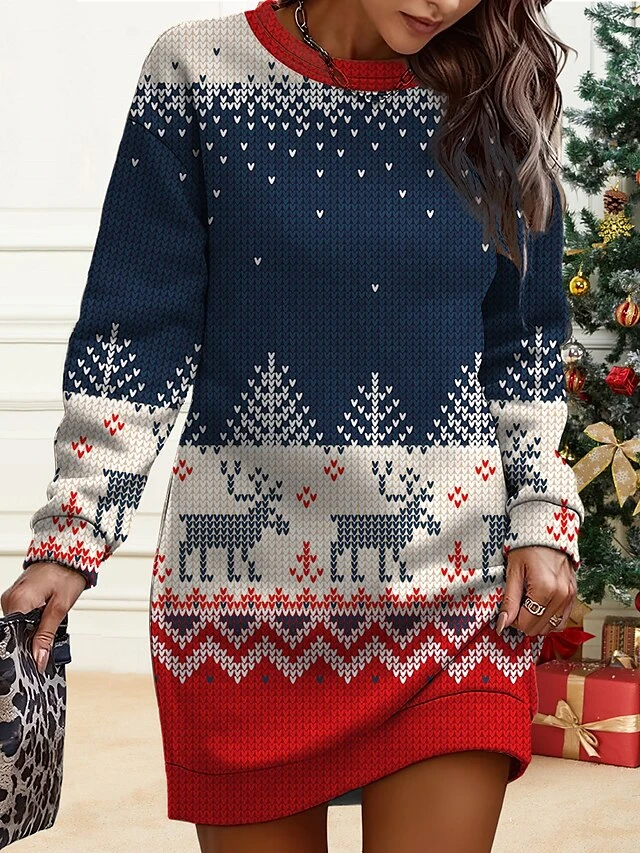 Women’s Christmas Casual Dress Sweatshirt Dress Mini Dress Warm Fashion OutdoorVacation Crew Neck Print Geometric Santa Claus Deer Loose Fit Burgundy Navy Blue Blue S M L XL XXL