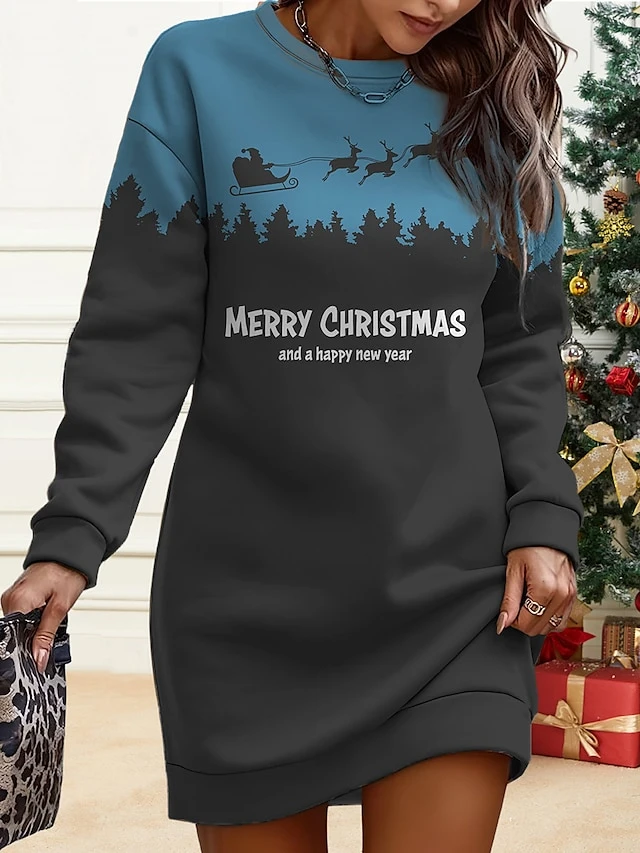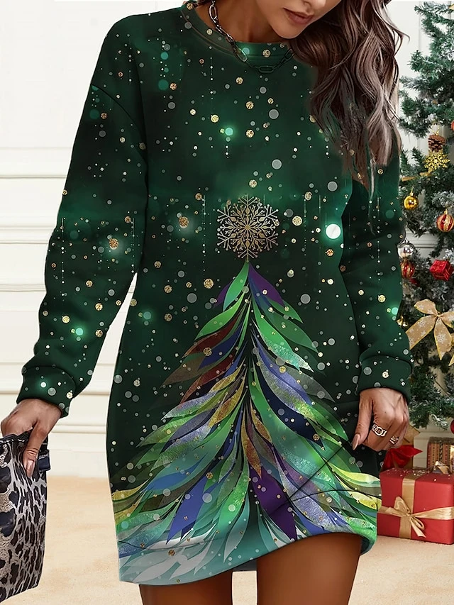 Women’s Christmas Casual Dress Sweatshirt Dress Mini Dress Warm Fashion OutdoorVacation Crew Neck PrintTree Loose Fit Black Blue Green S M L XL XXL