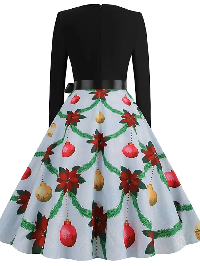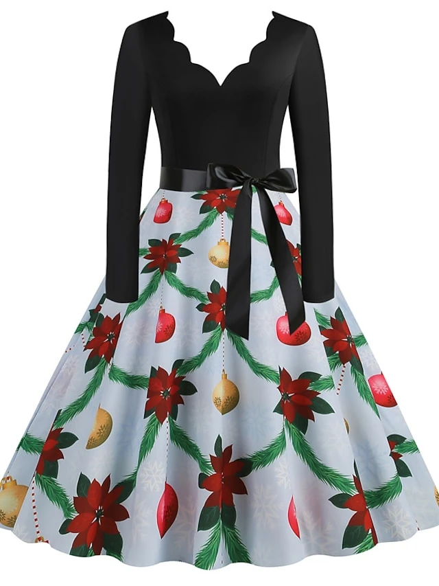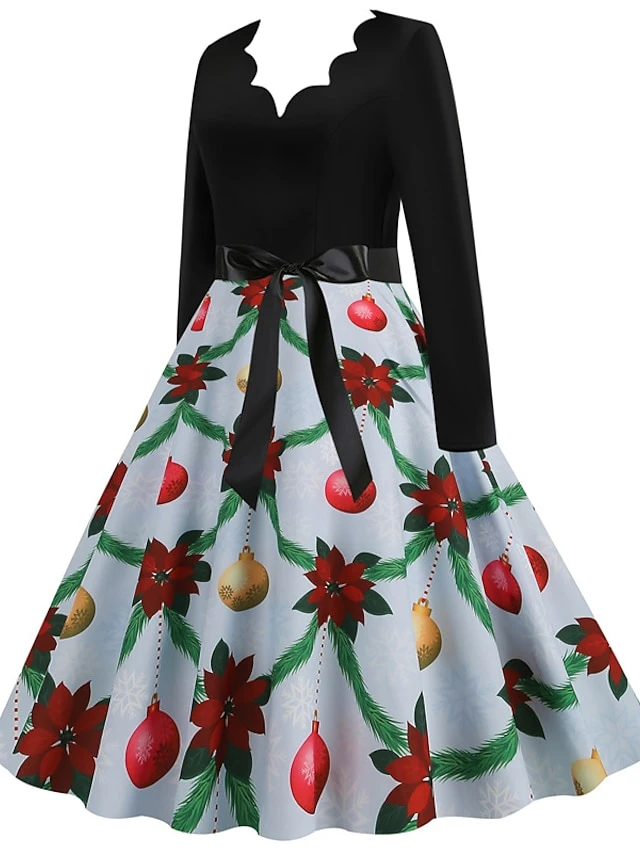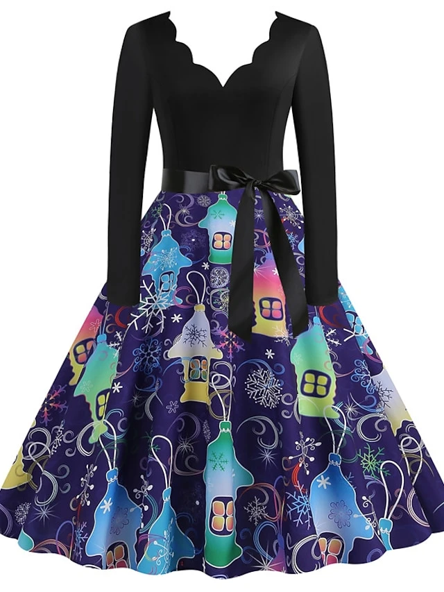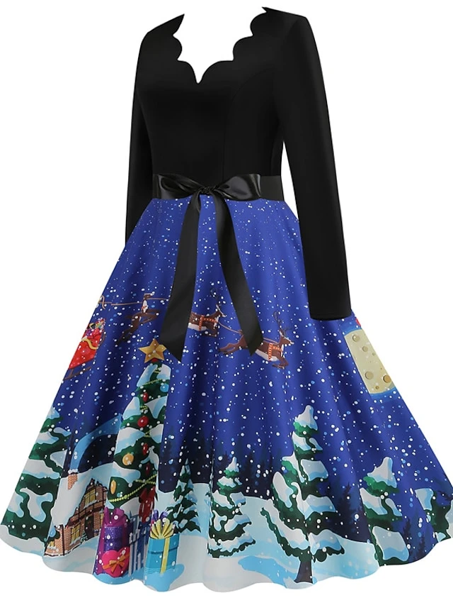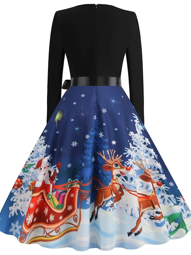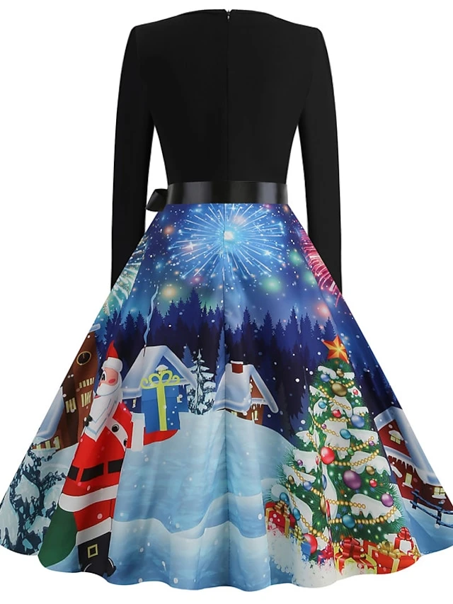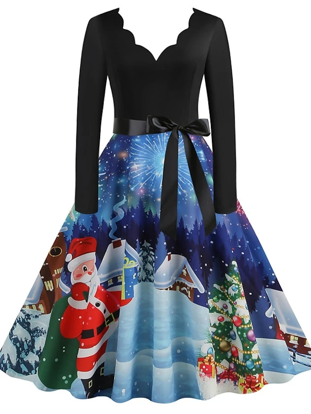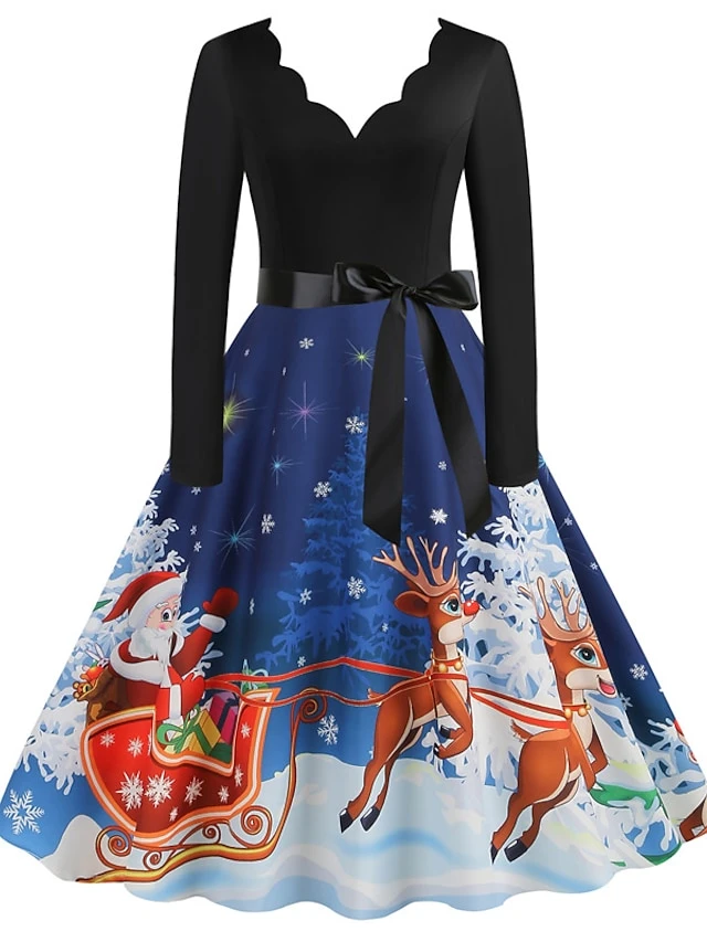 Women’s Christmas Casual Dress Swing Dress Midi Dress Blue Purple Royal Blue Light Blue White Long Sleeve Santa Claus Elk Tree Bow Print Winter Fall V Neck Vacation Vintage 2022 S M L XL