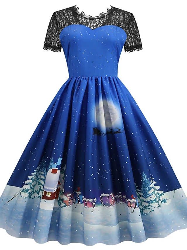 Women’s Christmas Casual Dress Swing Dress Midi Dress Blue Purple Royal Blue Short Sleeve Santa Claus Lace Print Winter Fall Crew Neck Vacation Vintage 2022 S M L XL XXL 3XL