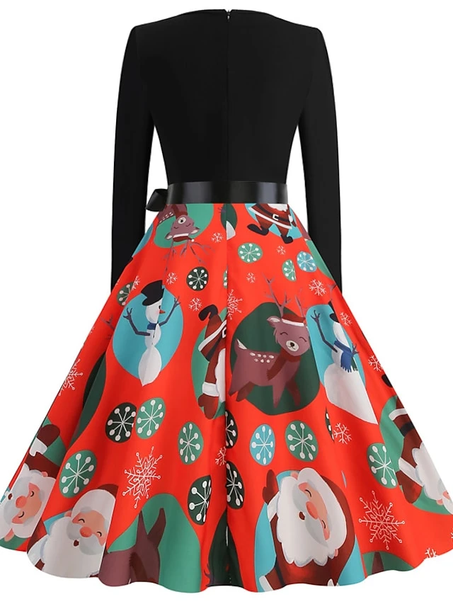 Women’s Christmas Casual Dress Swing Dress Midi Dress Green Light Green Red Long Sleeve Santa Claus Elk Snowman Bow Print Winter Fall V Neck Vacation Vintage 2022 S M L XL XXL 3XL
