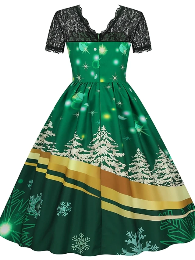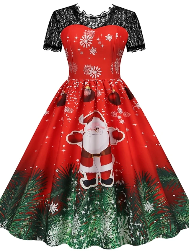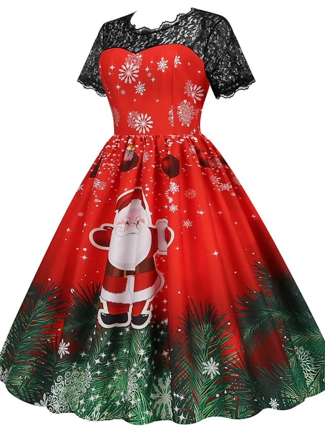 Women’s Christmas Casual Dress Swing Dress Midi Dress Green Wine Light Red Fuchsia Red Black Short Sleeve Santa Claus Snowman Snowflake Lace Print Winter Fall Crew Neck Vacation Vintage 2022 S M L XL