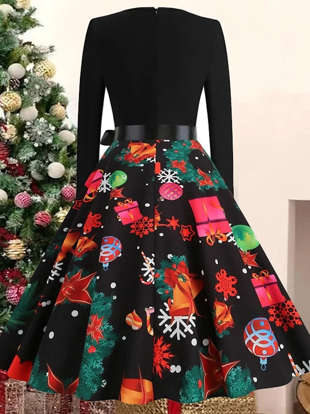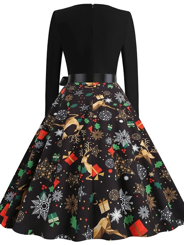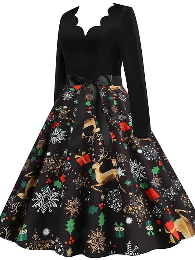 Women’s Christmas Casual Dress Swing Dress Vintage Dress Midi Dress Black Wine Orange Long Sleeve Animal Bow Winter Fall Autumn V Neck 2022 S M L XL XXL 3XL