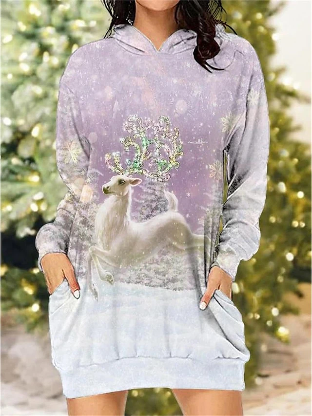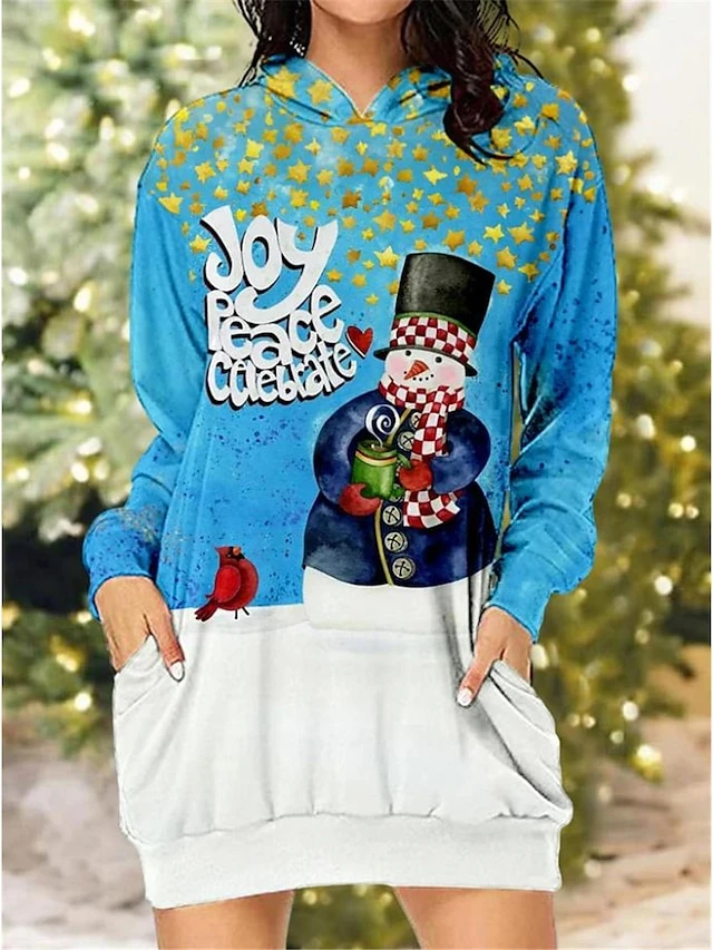 Women’s Christmas Dress Hoodie Dress Mini Dress Warm Fashion Outdoor Christmas Vacation Hoodie Pocket Print Santa Claus Snowman Christmas Tree Regular Fit Navy Blue Blue Sky Blue S M L XL XXL