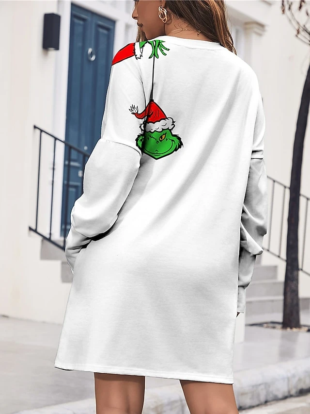 Women’s Christmas Dress Sweatshirt Dress Mini Dress Warm Fashion Outdoor Christmas Holiday Crew Neck Pocket Print Print Monster Loose Fit White S M L XL XXL