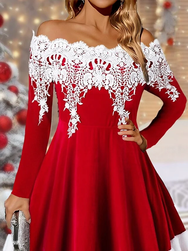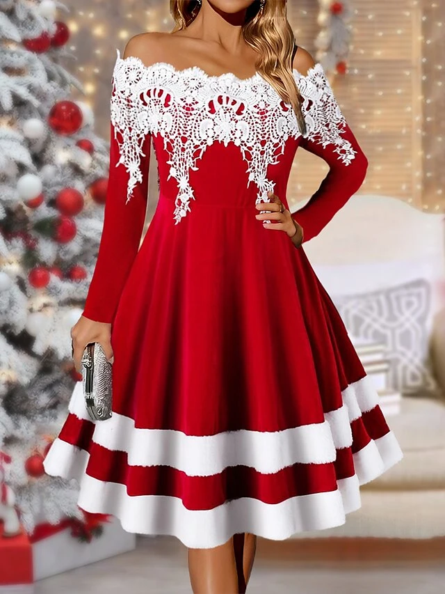 Women’s Christmas Dress Winter Dress Casual Dress Midi Dress Lace Patchwork Christmas Daily Date Fashion Streetwear Off Shoulder 3/4 Length Sleeve 2023 Regular Fit Burgundy Color S M L XL XXL Size