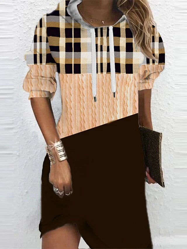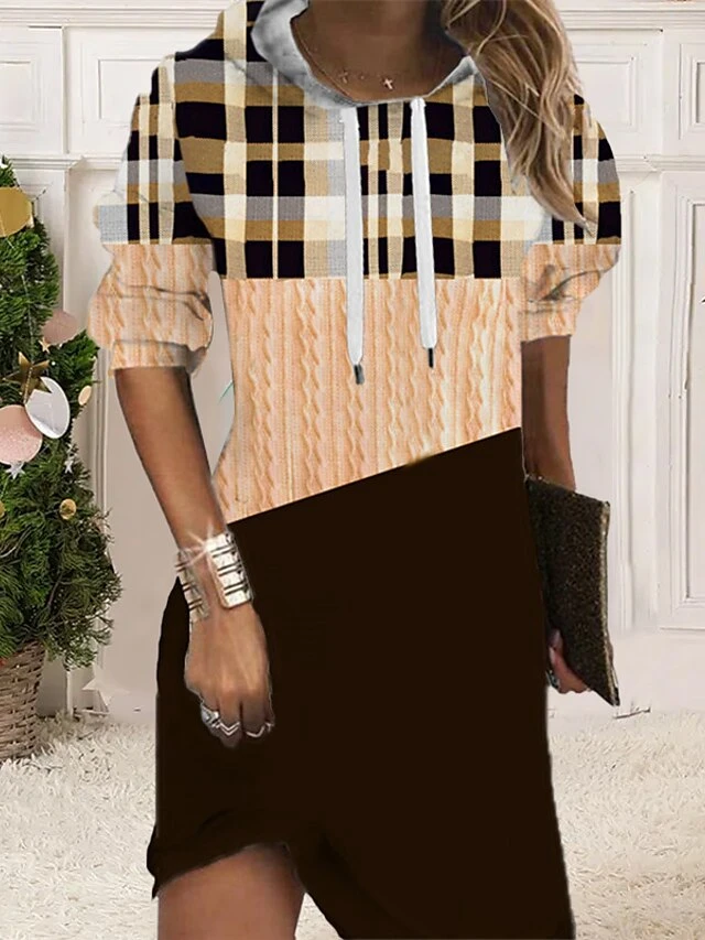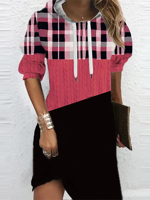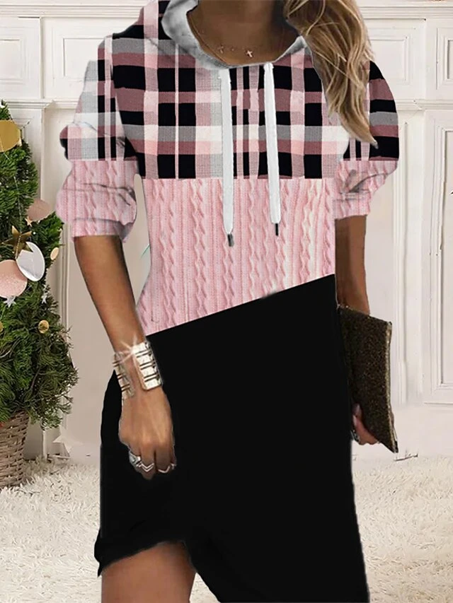 Women‘s Christmas Hoodie Dress Shift Dress Mini Dress Blue Pink Fuchsia Long Sleeve Plaid Print Fall Spring Hooded Daily Vacation Loose Fit 2022 S M L XL XXL 3XL
