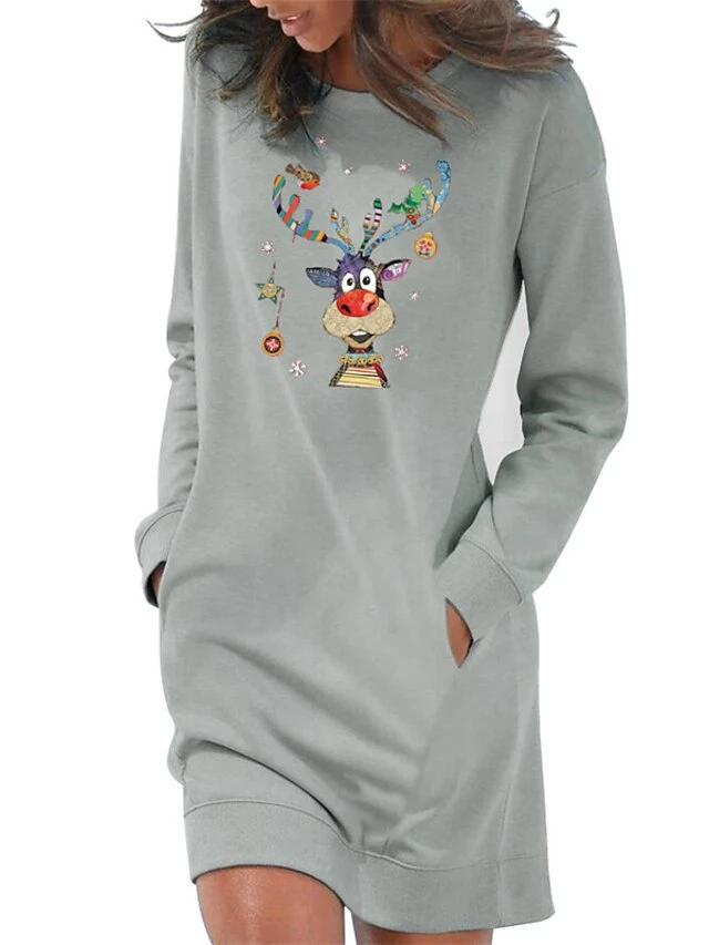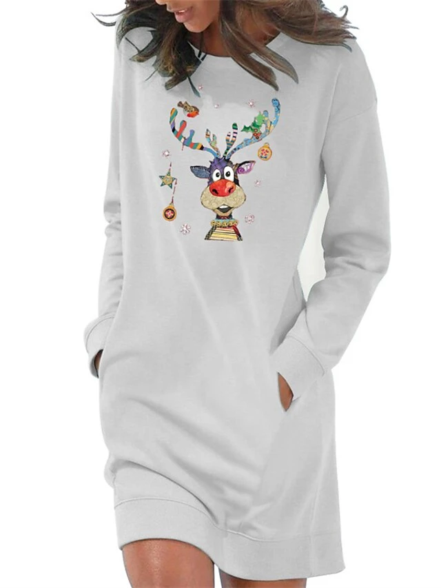Women‘s Christmas Hoodie Dress Winter Dress Light Blue Grey White Long Sleeve Elk Snowflake Pocket Print Winter Fall Crew Neck Stylish Casual 2022 S M L XL 2XL / Cotton