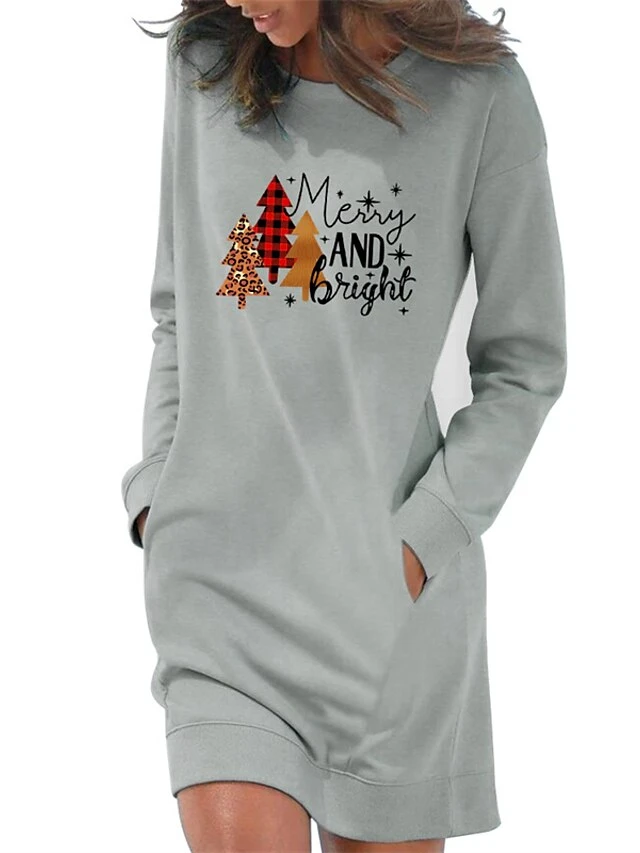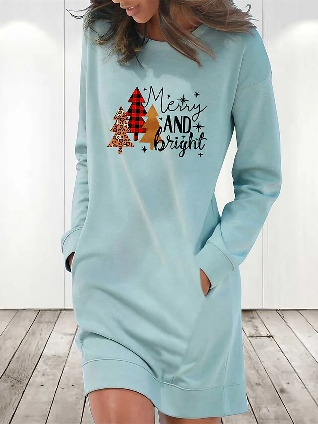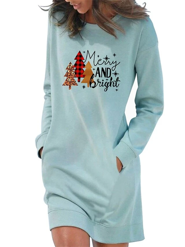 Women‘s Christmas Hoodie Dress Winter Dress Light Blue Grey White Long Sleeve Letter Tree Snowflake Pocket Print Winter Fall Crew Neck Stylish Casual Fall Dress Loose Fit 2022 S M L XL 2XL