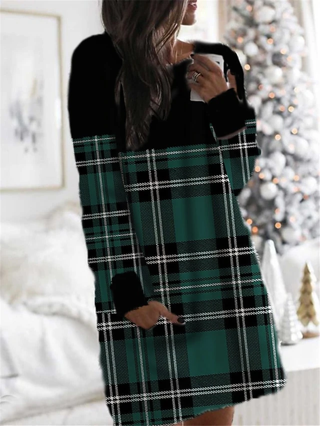 Women’s Christmas Hoodie Dress Winter Dress Mini Dress Green Light Red Fuchsia Red Gray White Long Sleeve Plaid Elk Snowflake Pocket Print Winter Fall Hooded Casual Loose Fit 2022 S M L XL XXL 3XL