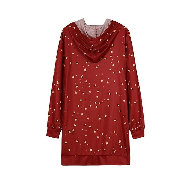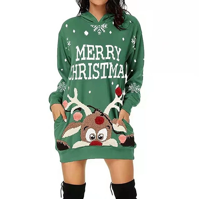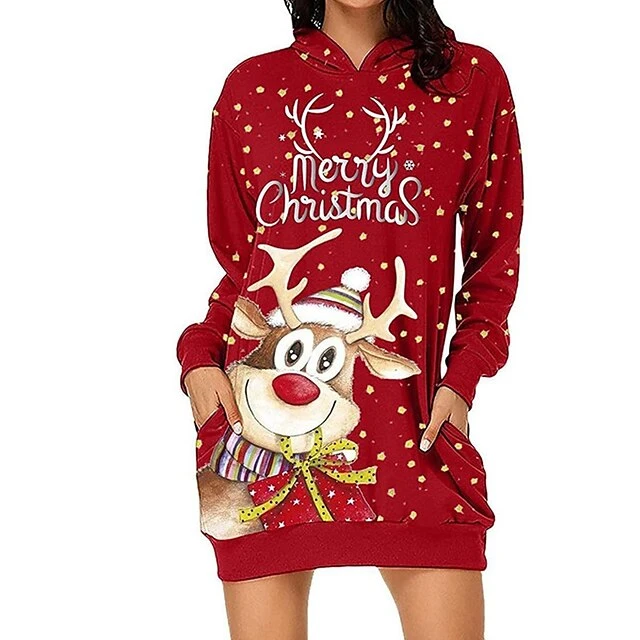 Women‘s Christmas Hoodie Dress Winter DressShort Mini Dress Red Black Long Sleeve Elk Tree Pocket Fall Winter Hooded Stylish Modern Loose Fit 2022 S M L XL XXL 3XL