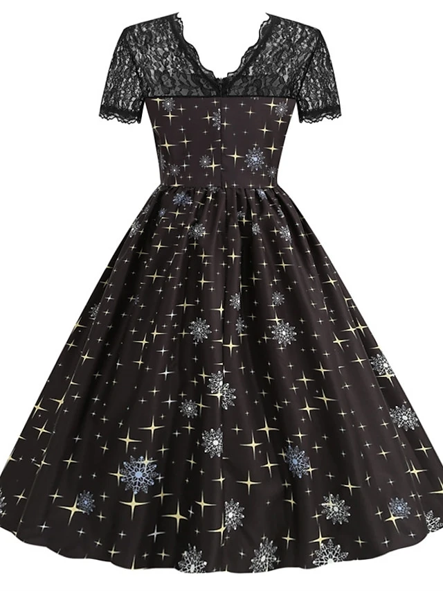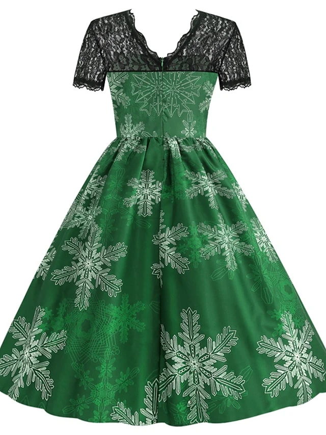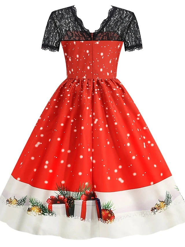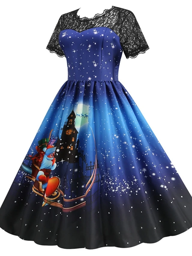 Women’s Christmas Knee Length Dress Blue Purple Wine Green Black Red Short Sleeve Print Lace Print Fall Winter Round Neck CasualRegular Fit 2021 S M L XL XXL 3XL