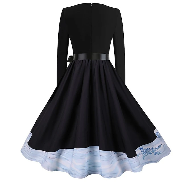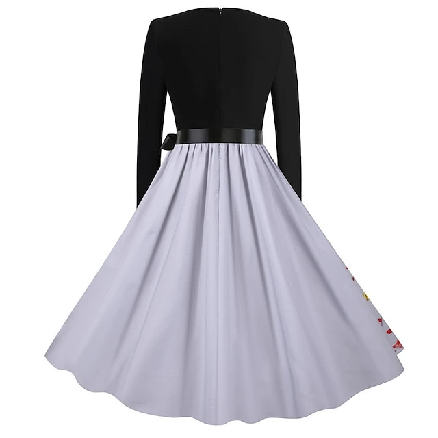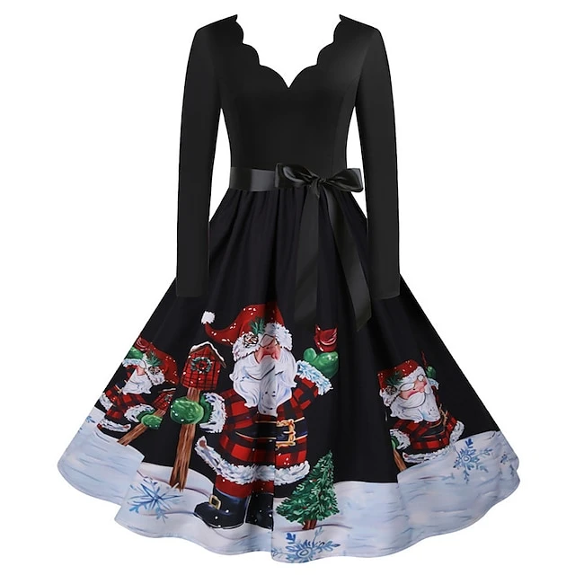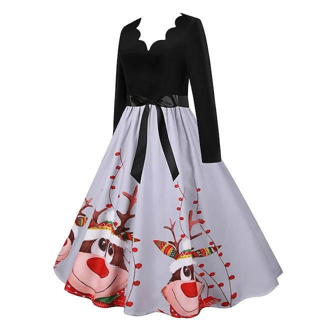Women’s Christmas Knee Length Dress Gray White Black Red Brown Long Sleeve Print Bow Print Fall Winter V Neck Casual Vintage2021 S M L XL XXL 3XL