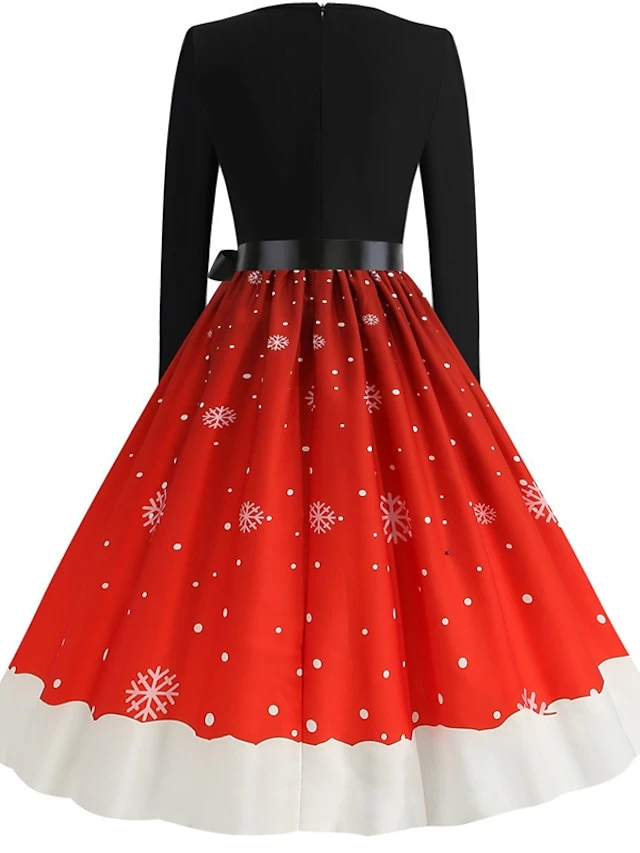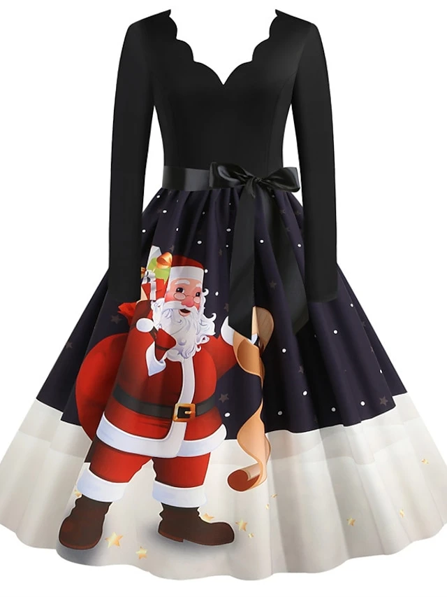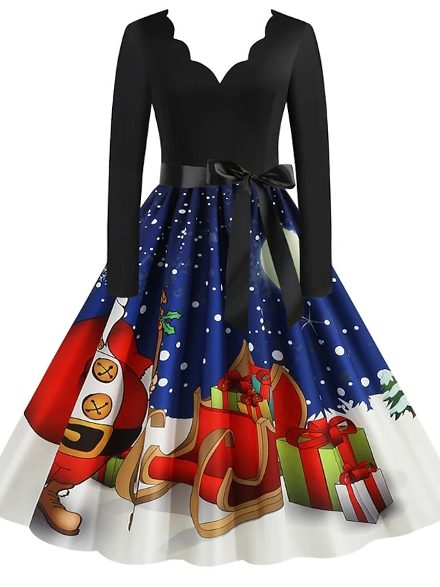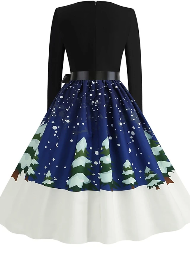 Women’s Christmas Party Dress Knee Length Dress Purple Royal Blue Dark Blue Red Black Long Sleeve Elk Tree Bell Bow Print Fall Winter V Neck Vintage Elegant Party 2022