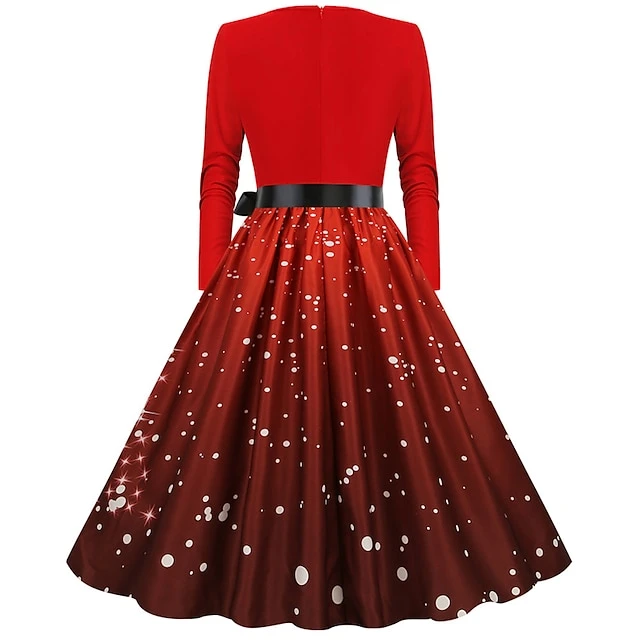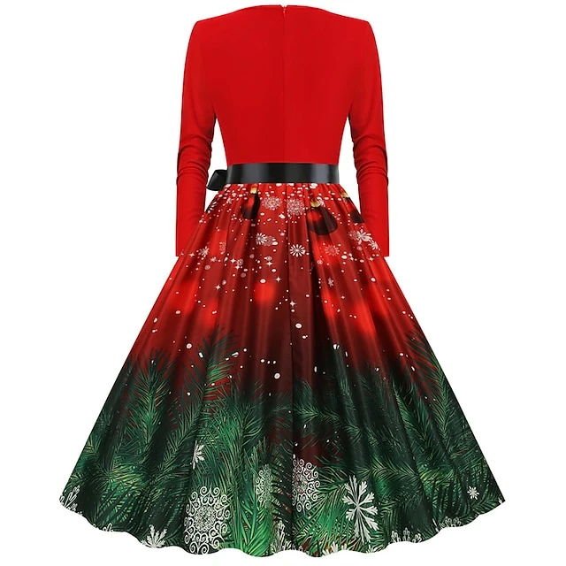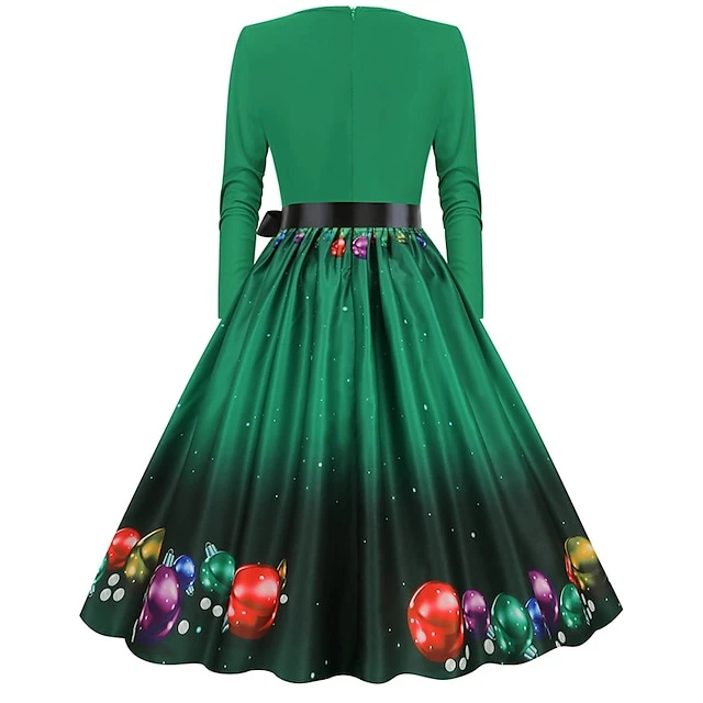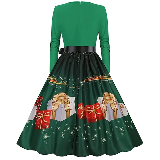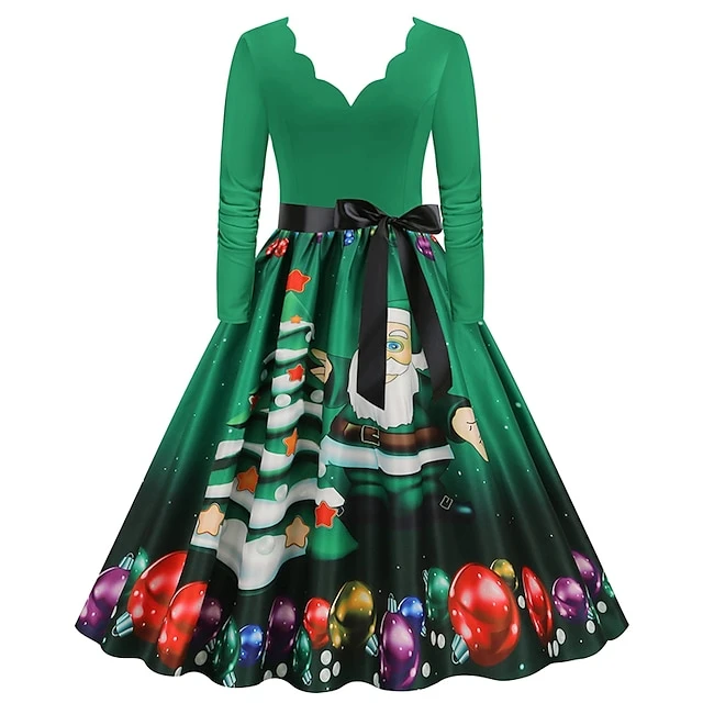 Women’s Christmas Party Dress Swing DressKnee Length Dress Green Wine Dark Green Red Black Long Sleeve Santa Claus Elk Snowman Print Fall Winter V Neck Vintage Party Elegant Party 2022 S M L XL XXL