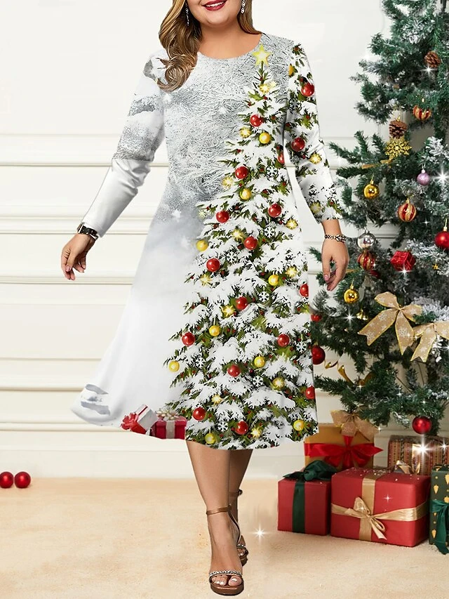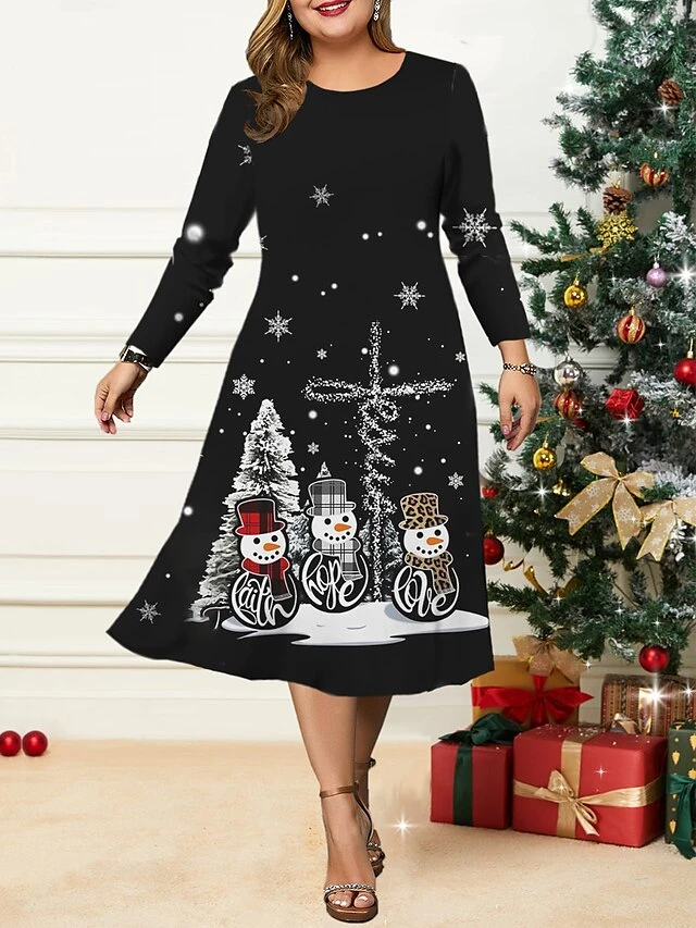 Women’s Christmas Plus Size Curve Casual Dress Skater Dress A Line Dress Snowman Christmas Tree Midi Dress Long Sleeve Print Crew Neck Fashion Outdoor Black Wine Fall Winter L XL XXL 3XL 4XL