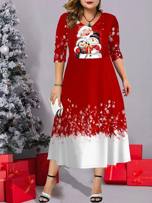 Women’s Christmas Plus Size Curve Casual Dress Work Dress Swing Dress Snowman Snowflake Midi Dress Half Sleeve Pocket Print V Neck Fashion Outdoor Red Gold Fall Winter L XL XXL 3XL 4XL