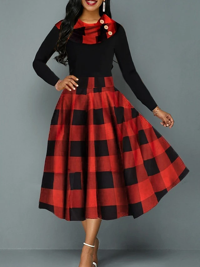 Women‘s Christmas Retro Elegant Vintage Dress Midi Dress Party Ruffle Patchwork Plaid Crew Neck Long Sleeve Regular Fit Fall Winter 2023 Red S M L XL