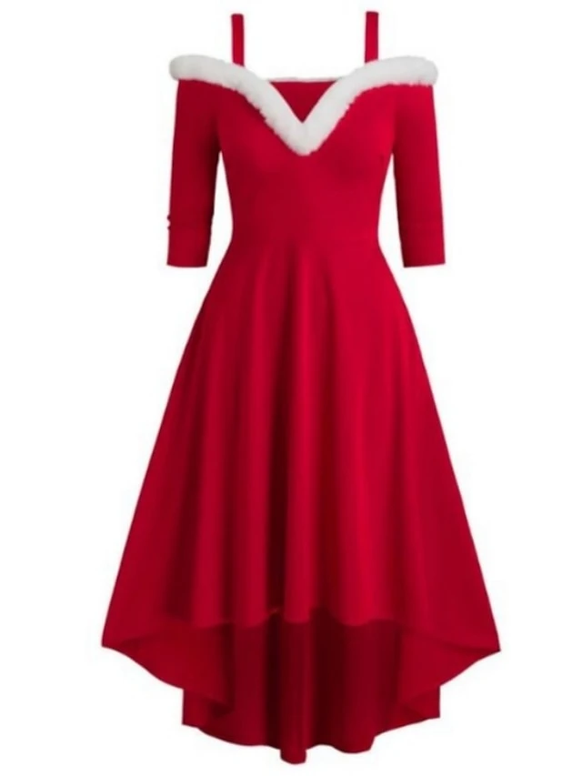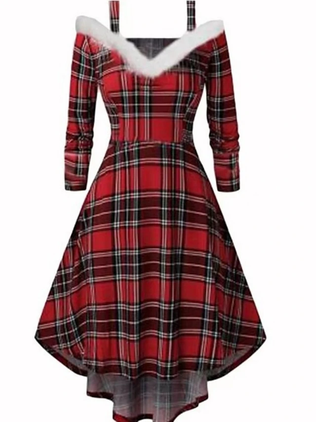 Women’s Christmas Shift Dress Vintage Dress Midi Dress Wine Red White Long Sleeve Plaid Faux Fur Trim Winter Fall Autumn Off Shoulder Vintage 2022 S M L XL 2XL