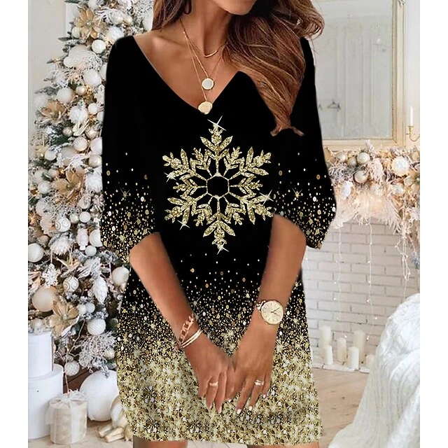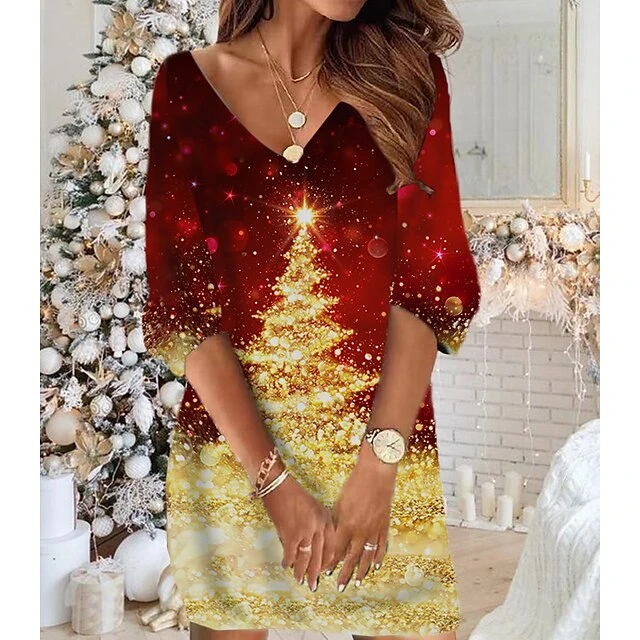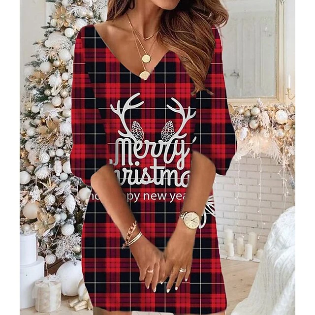 Women‘s Christmas Sweatshirt Dress Winter Dress Short Mini Dress Red 3/4 Length Sleeve Plaid Letter Print Fall Winter V Neck Vacation Casual 2022 S M L XL XXL 3XL