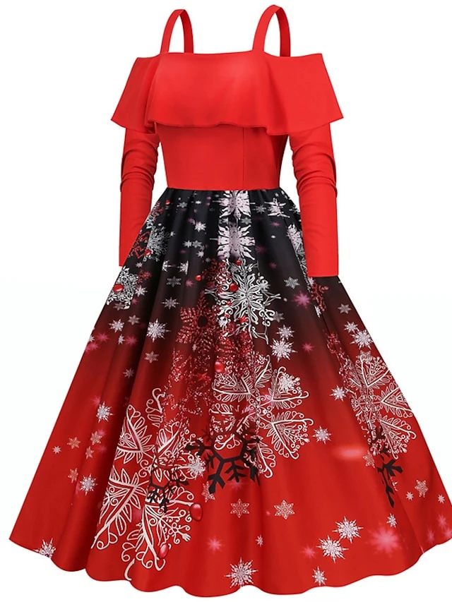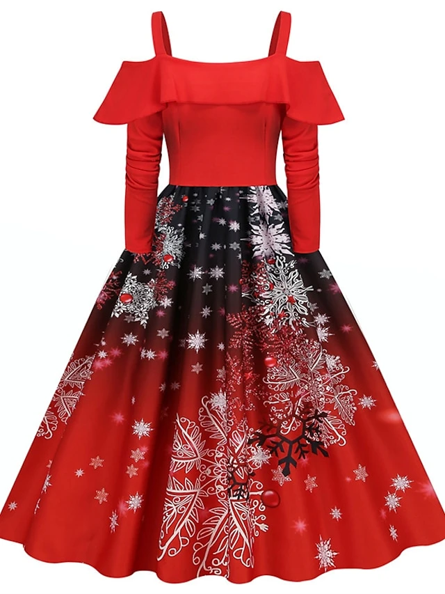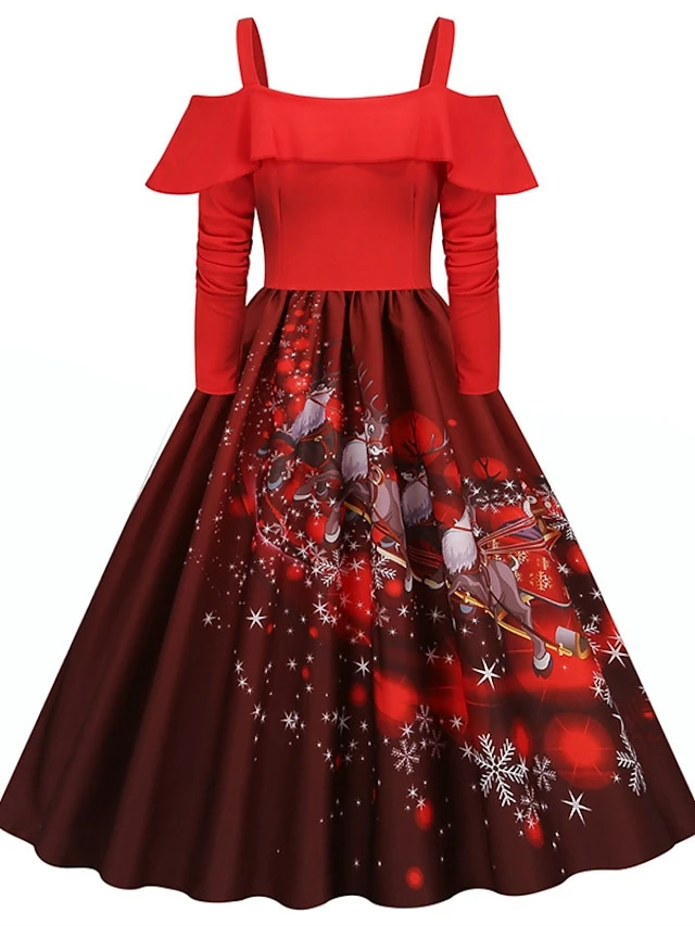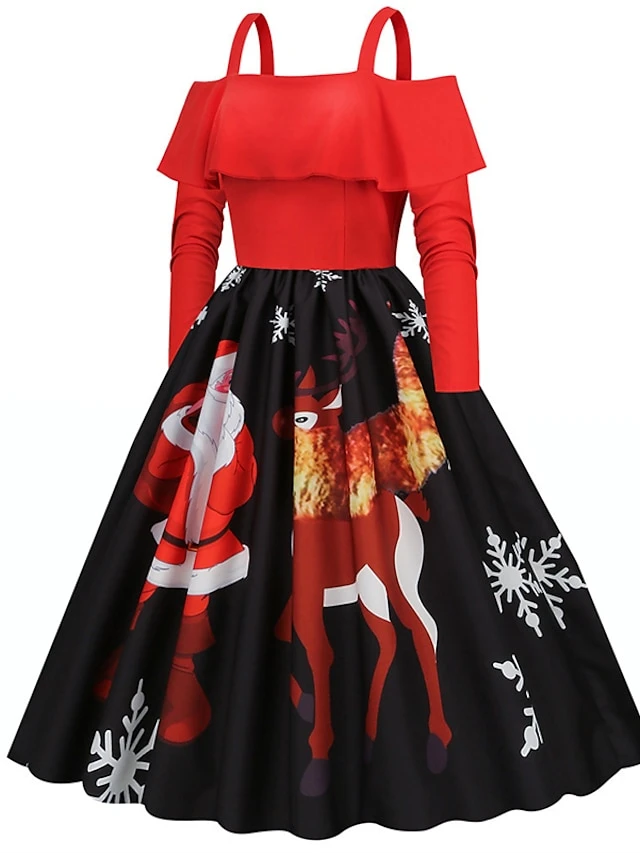 Women’s Christmas Swing Dress Slip Dress Vintage Dress Midi Dress Black Wine Light Red Long Sleeve Santa Claus Cold Shoulder Winter Fall Autumn Spaghetti Strap Modern Vacation 2022 S M L XL XXL 3XL